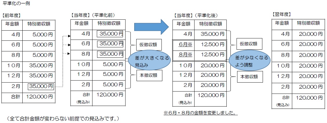 そのため、この差額が特に大きい方について、保険料が年間を通じてできるだけ均等になるよう、6月、8月の仮徴収額を調整(平準化)します。