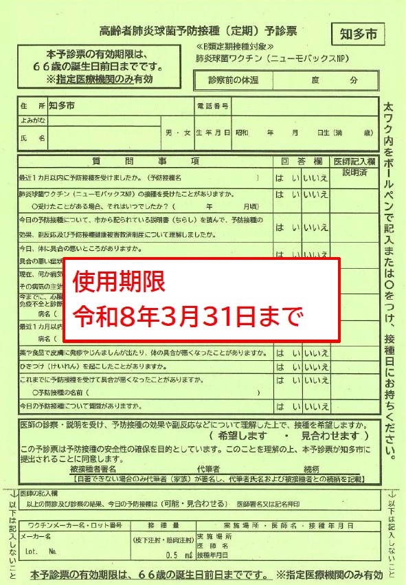 令和7年度に発行した、「ニューモバックスNP」用の予診票(黄緑色)は、令和8年4月1日以降は使用できません。