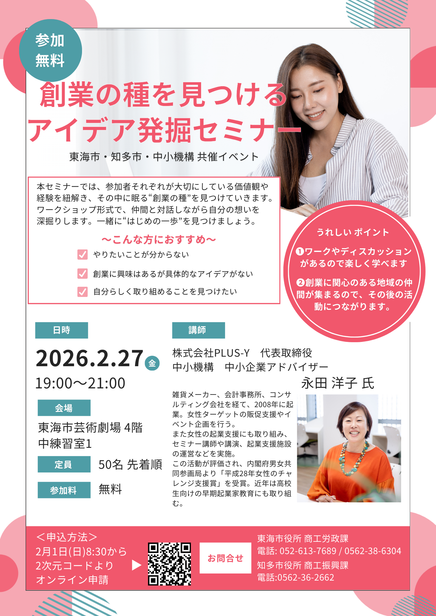 知多市役所商工振興課(2階)または東海市役所商工労政課(5階)
