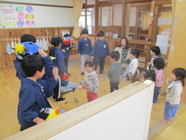 0、1歳児は「おにのじまん」の体操を保育士と一緒に楽しんだ後、年長組の鬼役に向かって豆まきをしました。驚いて泣いてしまう子どももいましたが鬼の的に投げ、やっつけることができました!