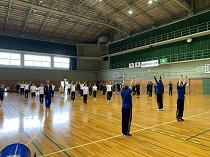 本研修会では、ラジオ体操指導士(1級・2級)の資格を持っておられる武豊町スポーツ推進委員7名を講師としてお迎えし、講演テーマ「いつまでも生き生きと!ラジオ体操のポイント」と題し、ラジオ体操の実演指導をしていただきました。