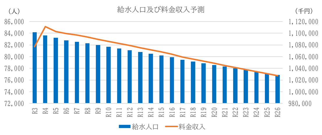 令和3年10月に料金改定を行っているため、料金収入は一時的に増加しましたが、給水人口が減少する見込みのため、連動して料金収入の減少が見込まれています。