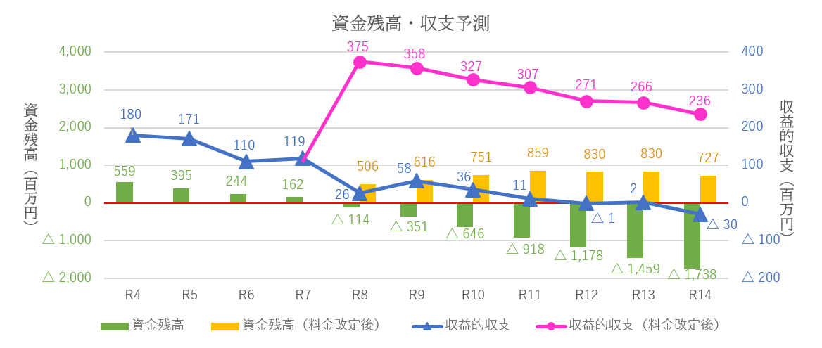 料金改定を行わず借入も抑制したうえで施設更新計画を進めると、経営は令和8年度に資金が枯渇し、令和12年度に赤字になると試算しています。(令和6年度実績を基に算出)