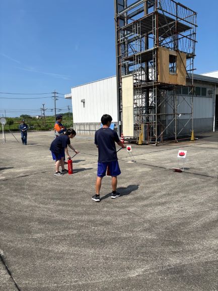 防火・防災についての知識を学ぶもので、現役の消防団員に指導していただき、実際に放水訓練や消火器の取扱い