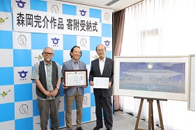 加古歯科医院理事長 加古美裕(よしひろ)さんが、オーストラリアの風景を描いたシルクスクリーン作品2点を市に寄附するため、制作者の森岡完介さんと市役所を訪問されました。