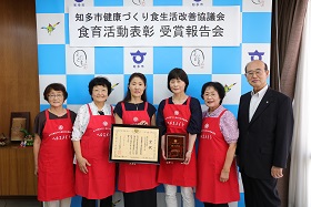 農林水産省が主催する第9回食育活動表彰で、消費・安全局長賞を受賞した知多市健康づくり食生活改善協議会が市長に受賞を報告しました。