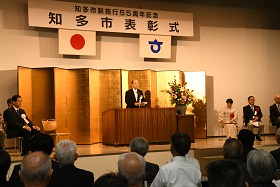 知多市表彰条例に基づき、市政各般にわたり多大な貢献をした人を表彰する知多市表彰式が行われました。一般表彰43件、感謝状2件の表彰のほか、記念映像の上映や記念アトラクション、55年を振り返るパネル展示が行われました。