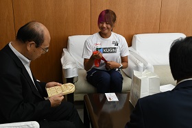 市長は、「先月お会いしたときに『優勝を勝ち取る』と力強く語っておられましたが、その言葉どおりに見事な結果を出されたことに、心から感動するとともに、知多市長としてとても誇らしく思っております。これからもさらなる高みを目指して挑戦を続けられ、ますますご活躍されることを楽しみにしております。」と述べました。
