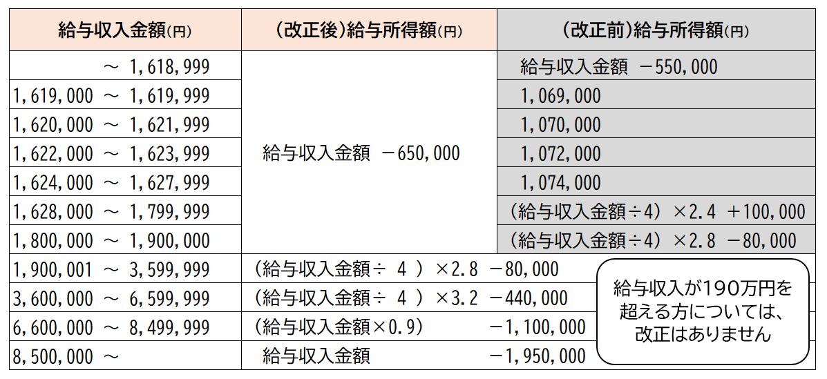 給与収入が190万円以下の場合について、給与所得控除額が10万円引き上げられ、65万円となります。