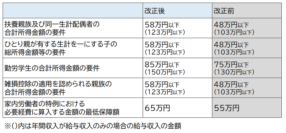 各種扶養控除に係る所得要件等が下表のとおり10万円引き上げられます。