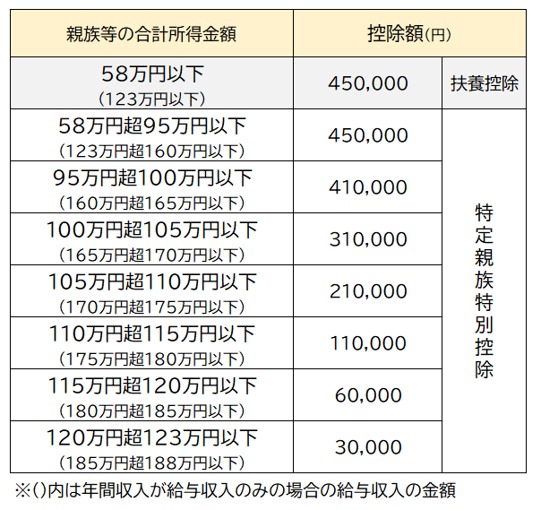 控除額は、親族の所得に応じて下表のとおり変動します。