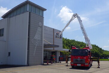 知多市には、直伸はしご車と屈折はしご車があります。直伸はしご車は、はしごを伸ばすと35mでビルの約11階、屈折はしご車は25mでビルの約8階までとどき、高い場所でも人を救助することができます。