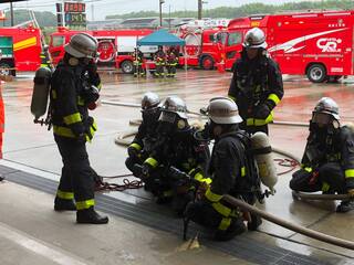しかし、火事の現場ではそれだけでなく、背中に空気呼吸器という空気のボンベを背負ったり、ホースなどの道具を持って活動します。