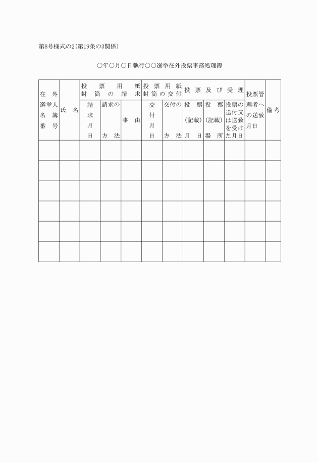 第8条の2 法第30条の13第2項において準用する法第29条第2項の規定により在外選挙人名簿の修正に関し、調査の請求があったときは、第2号様式の2の在外選挙人名簿の修正に関する調査票により整理しなければならない。