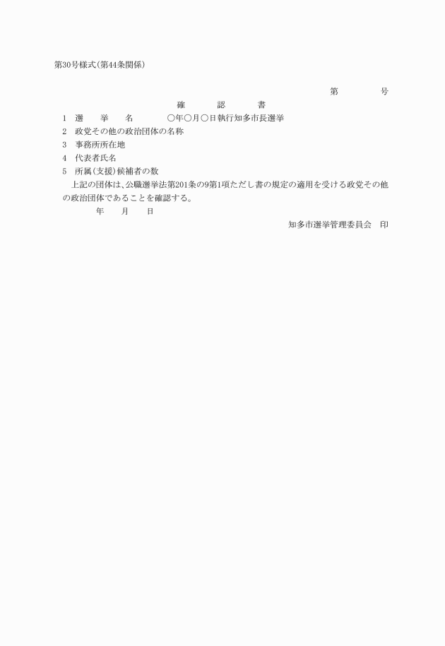 第44条 法第201条の9第3項の規定により市長の選挙において政党その他の政治団体に交付する確認書は、第30号様式のとおりとする。