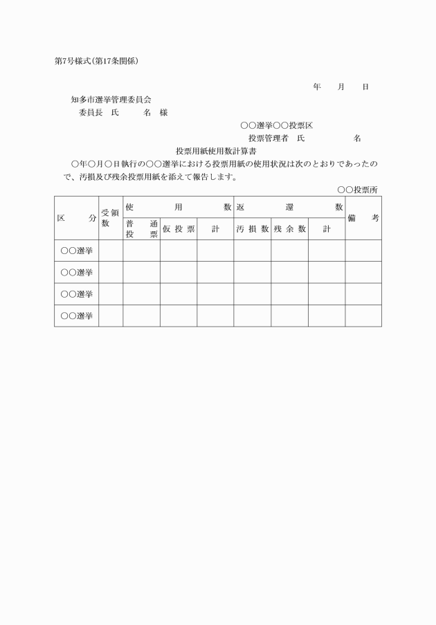 第17条 投票管理者は、投票所の事務を終了したときは、直ちに第7号様式により投票用紙使用数計算書を作成し、汚損及び残余の投票用紙を添えて委員会に報告しなければならない。