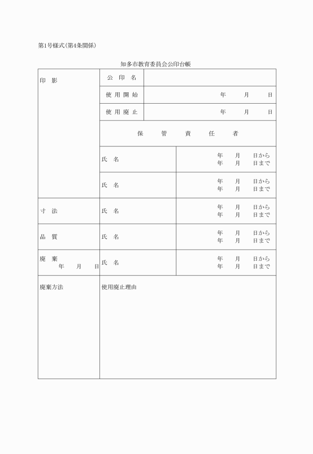 第4条 教育部学校教育課長(以下「学校教育課長」という。)は、公印台帳(第1号様式)を作成し、公印の作成、改刻又は廃止の都度必要な事項を登載しなければならない。
