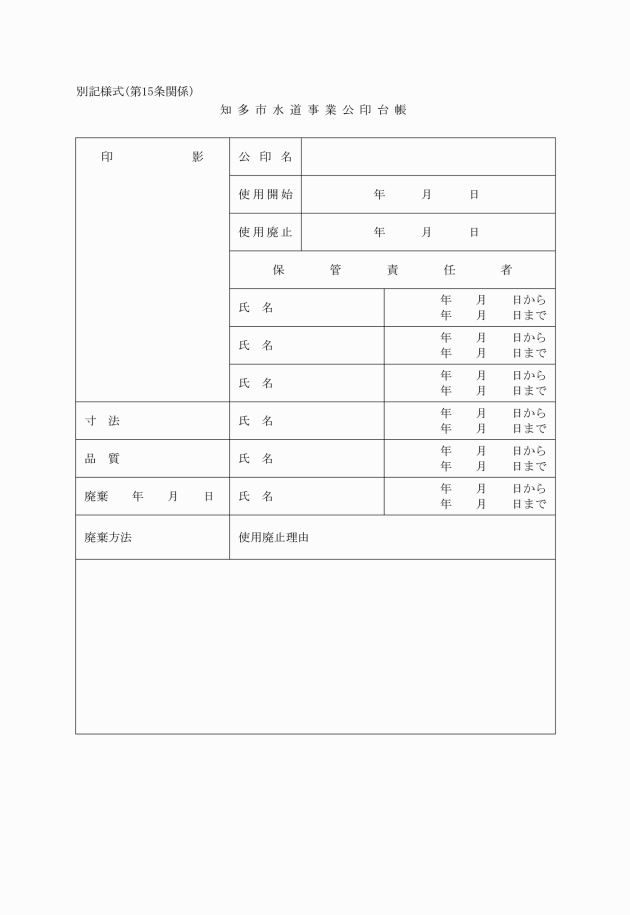 第15条 課長は、公印台帳(別記様式)を作成し、公印の作成、改刻又は廃止の都度必要な事項を登載しなければならない。