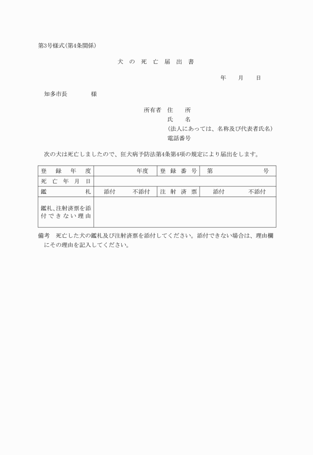 第4条 省令第8条第1項の規定による死亡の届出は、犬の死亡届出書(第3号様式)によるものとする。