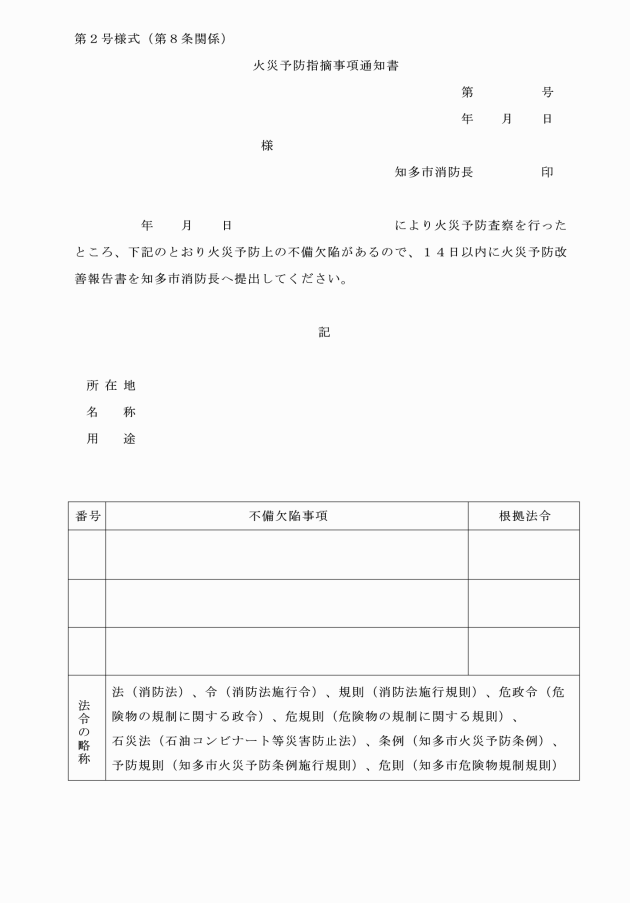 第8条 消防長は、査察を行った結果、不備欠陥事項があるときは、当該査察対象物の関係者に対して、火災予防指摘事項通知書(第2号様式)により通知をするものとする。