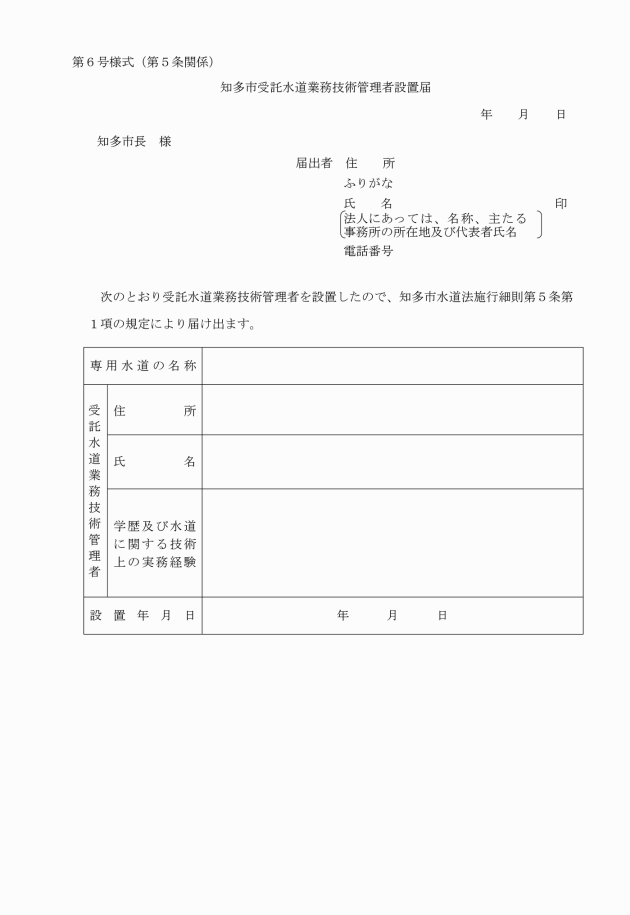 第5条 法第34条第1項において準用する法第24条の3第1項の規定により業務の委託を受ける者(以下「水道管理業務受託者」という。)は、法第34条第1項において準用する法第24条の3第3項の規定により受託水道業務技術管理者を設置したときは、10日以内に知多市受託水道業務技術管理者設置届(第6号様式)を市長に提出しなければならない。