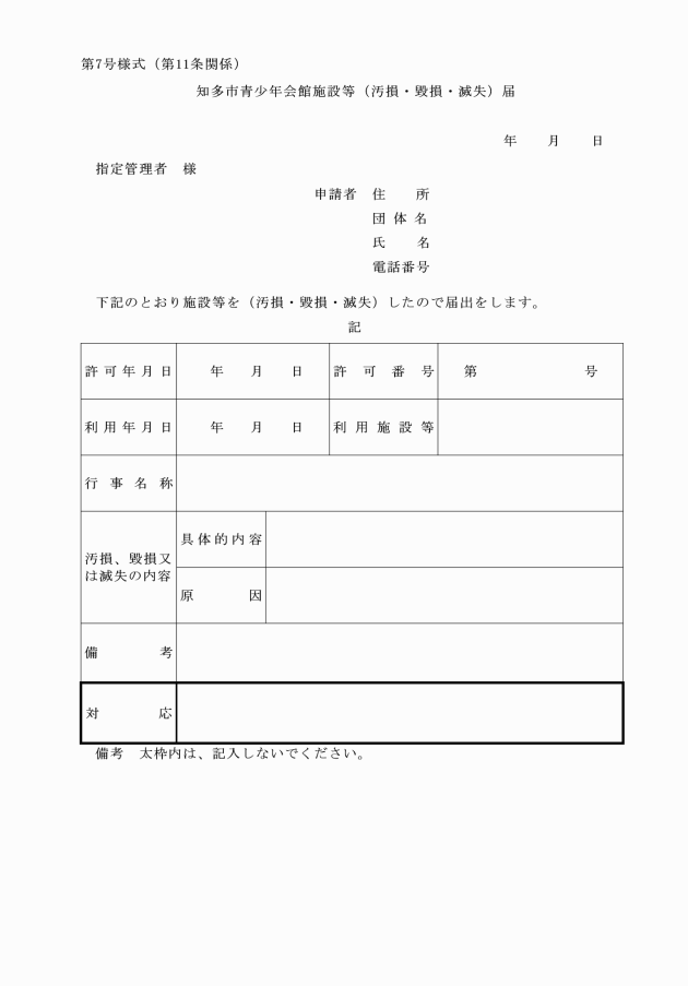 第11条 利用者は、施設等を汚損し、毀損し、又は滅失したときは、知多市青少年会館施設等(汚損・毀損・滅失)届(第7号様式)を直ちに指定管理者に提出し、その指示を受けなければならない。